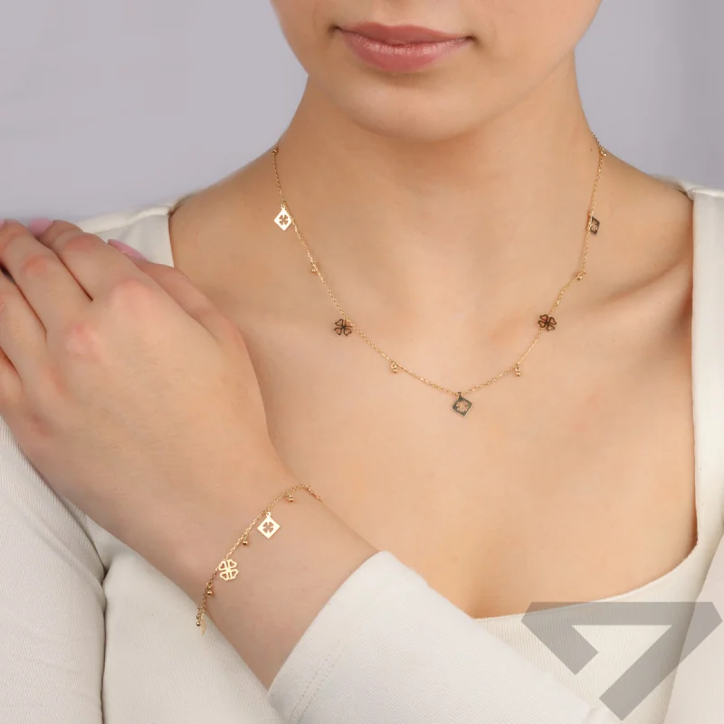 Subtelna bransoleta wykonana ze złota próby 375. Bransoleta zdobiona jest koniczynkami i gładkimi kulkami.
