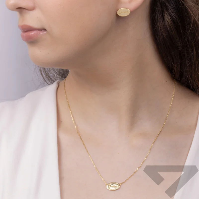 Komplet kolczyków i naszyjnika wykonany ze srebra próby 925 w żółtym kolorze. Oba elementy posiadają zdobienie w kształcie owalu z napisem DREAM.